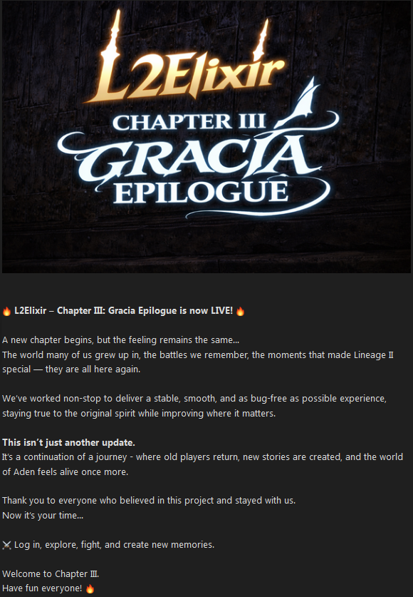 We sincerely thank everyone who continues to support this major effort to bring back the true legacy of L2Elixir, even after 18+ years.